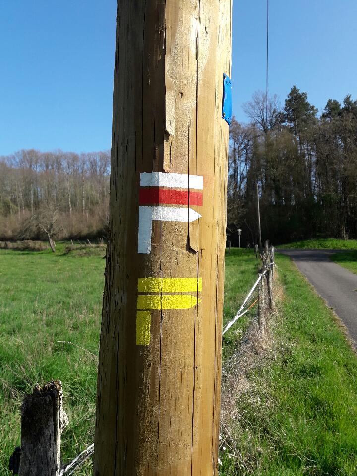 Une marque de peinture blanche et rouge sur un arbre, nous voilà rassuré d'être sur un sentier de grande randonnée.